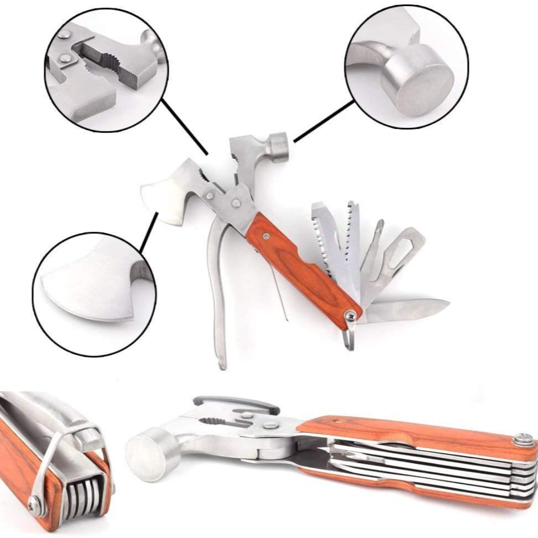 • Multi Tool Set -16 in 1 outdoor multi-tool includes hatchets, hammer, screwdriver, wire cutter, plier handle, file, spring, mini knife, bottle opener, file assorted hex wrench, fish descaler, wood saw.